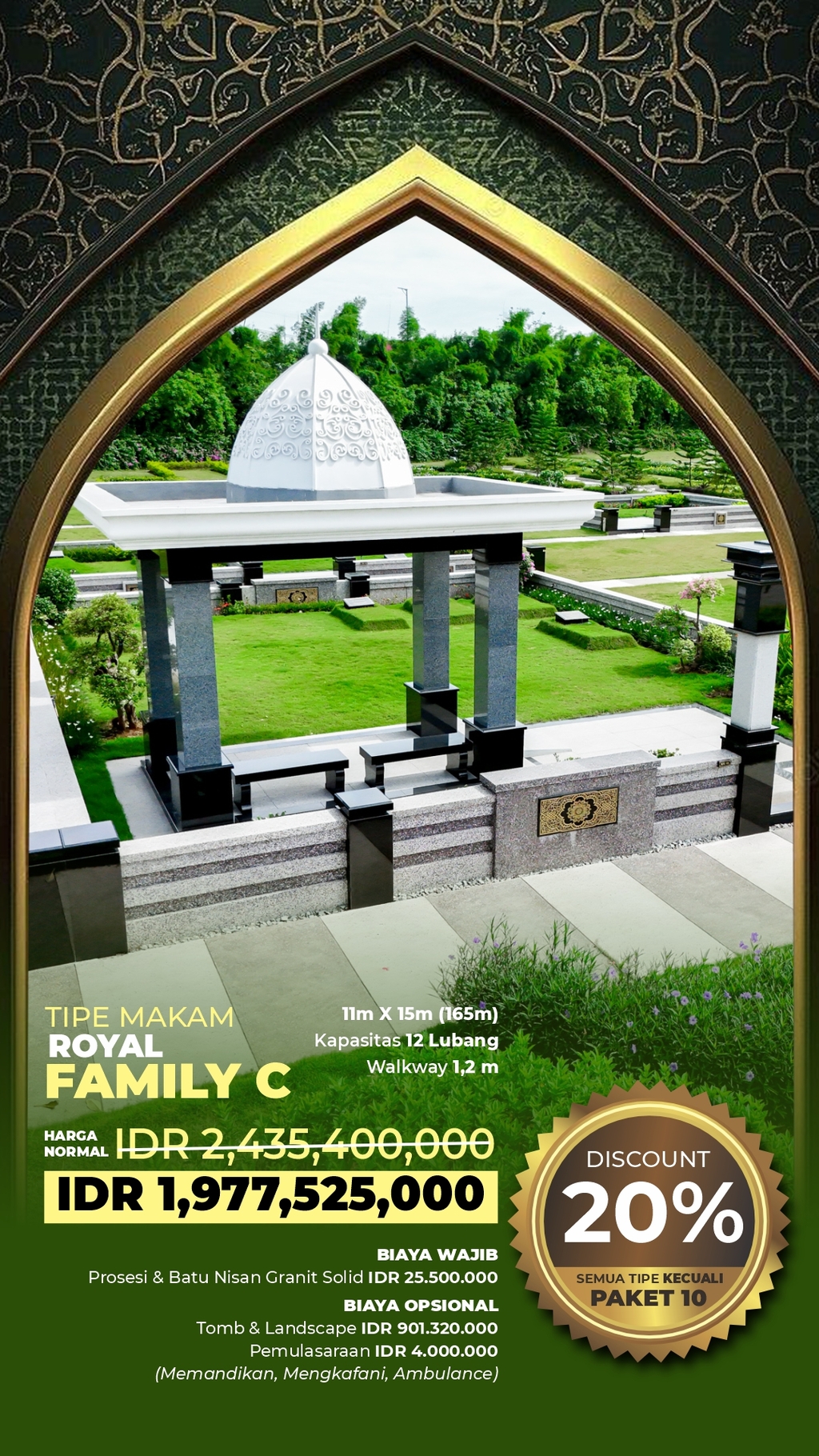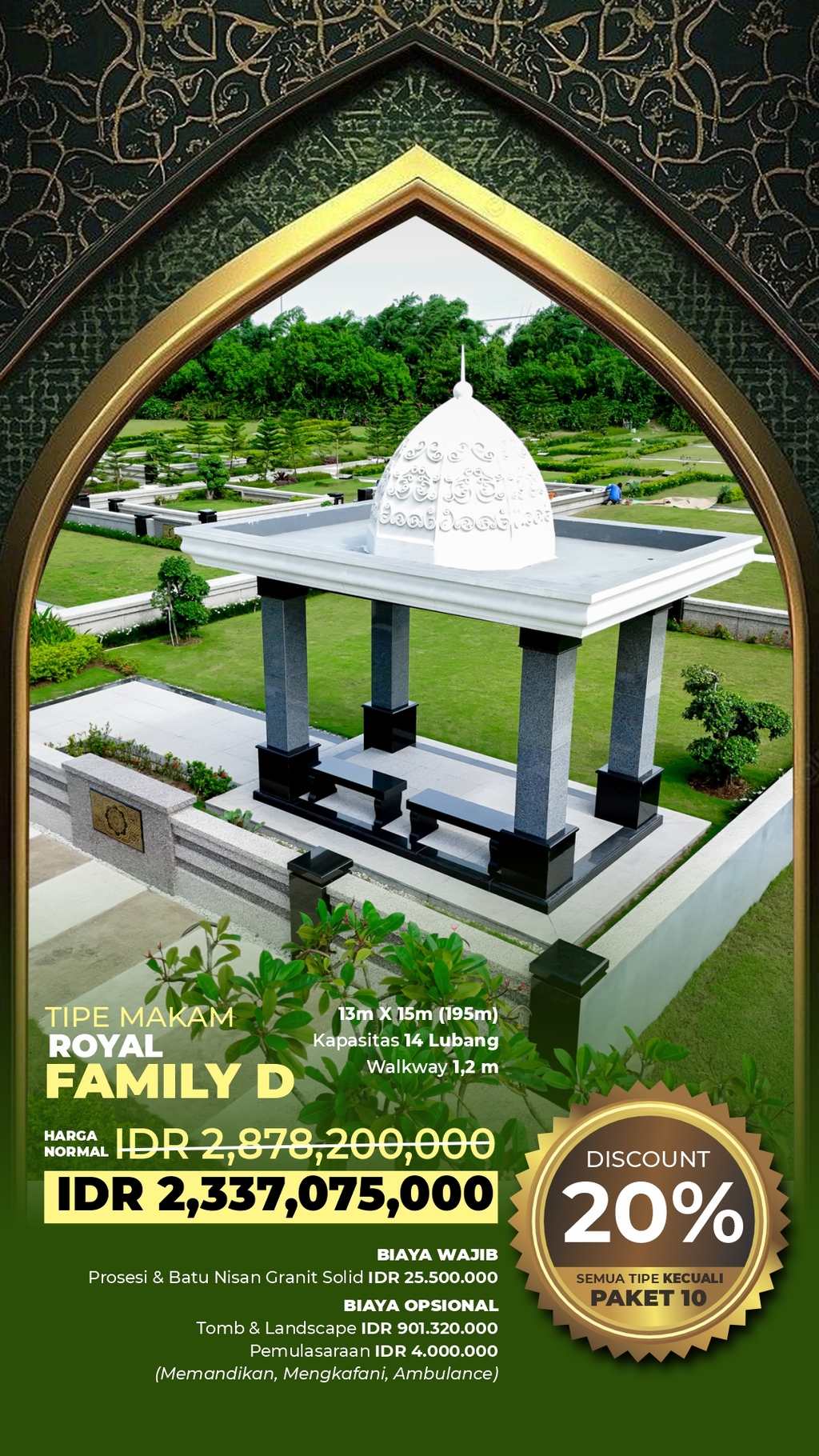 Tipe makam Royal Family D merupakan kavling makam keluarga besar dengan area luas di kawasan pemakaman muslim premium dan taman memorial eksklusif. Cocok bagi keluarga yang ingin memiliki area makam keluarga dalam satu lokasi pemakaman elite.